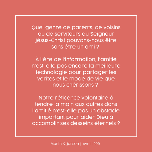 [cta link= »https://www.churchofjesuschrist.org/study/scriptures/dc-testament/dc/84?lang=fra » text= »Et de plus, je vous le dis, mes amis, car dorénavant, je vous appellerai amis, il est opportun que je vous donne ce commandement, afin que vous deveniez comme mes amis à l’époque où j’étais avec eux, voyageant pour prêcher l’Évangile avec mon pouvoir ; » button_text= »Doctrine et Alliances 84:77″ button_color= »#435673″ bg_color= »#99B5DD » text_color= »#FFFFFF »]