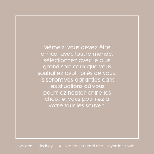 Il reste encore tellement de choses à apprendre au sujet de la véritable amitié. Mais j’espère que ces quelques écritures et citations vous auront mis sur le bon chemin pour commencer. Ne vous en faites pas, nous faisons tous des erreurs. Nous ne serons parfaits qu’après de nombreuses épreuves et de nombreux rafinements de la part du Père. Mais nous pouvons commencer aujourd’hui à nous efforcer de nous améliorer en devenant de véritables amis.